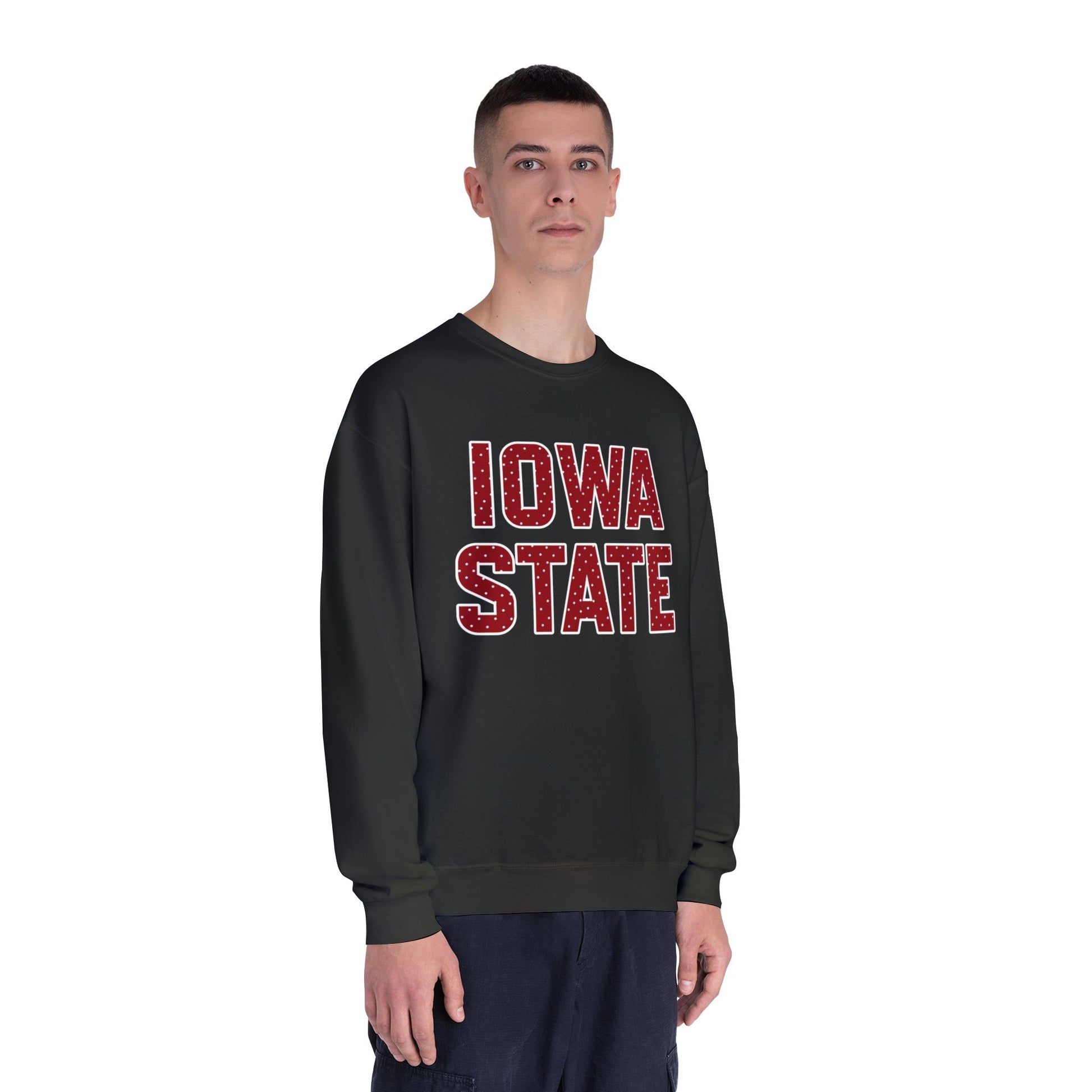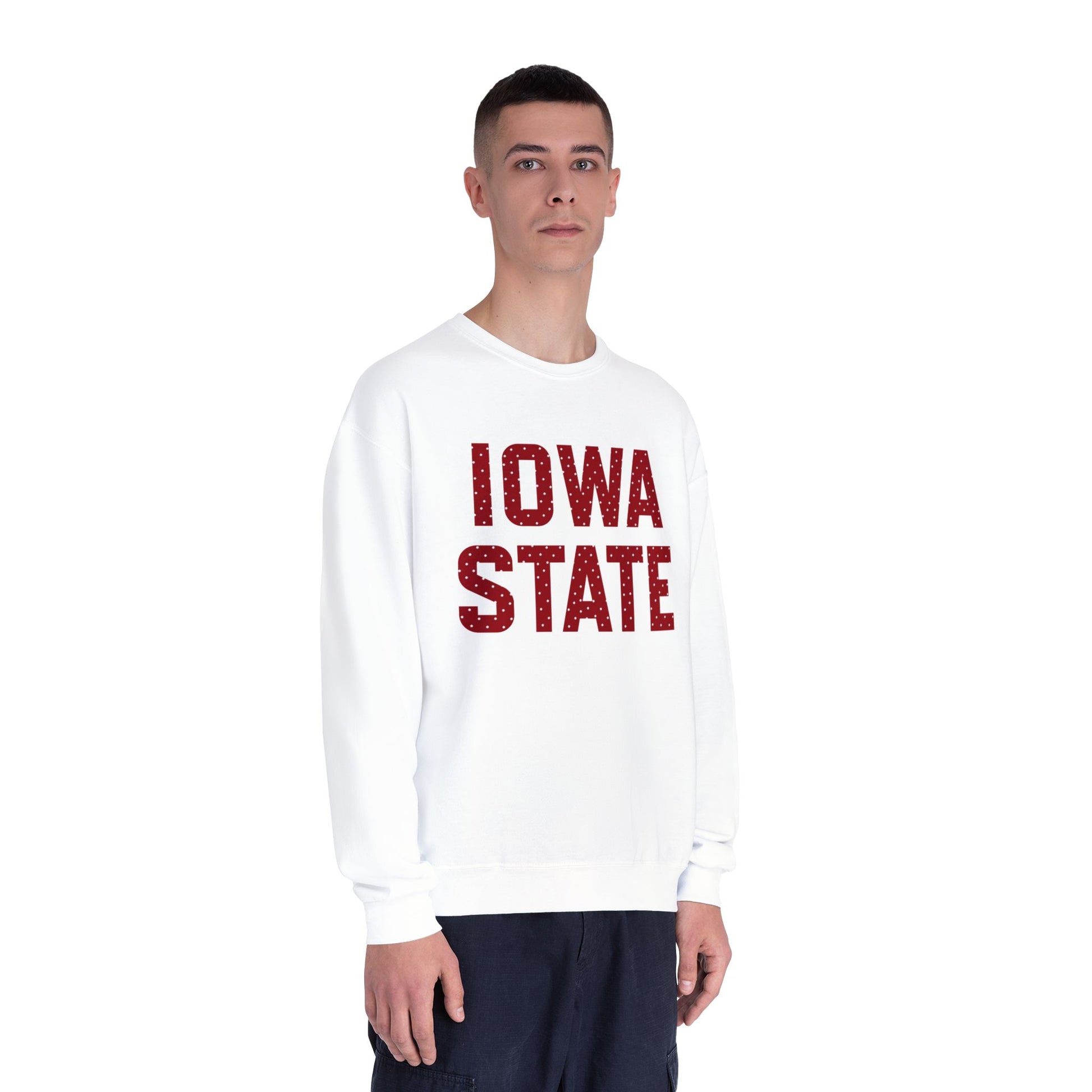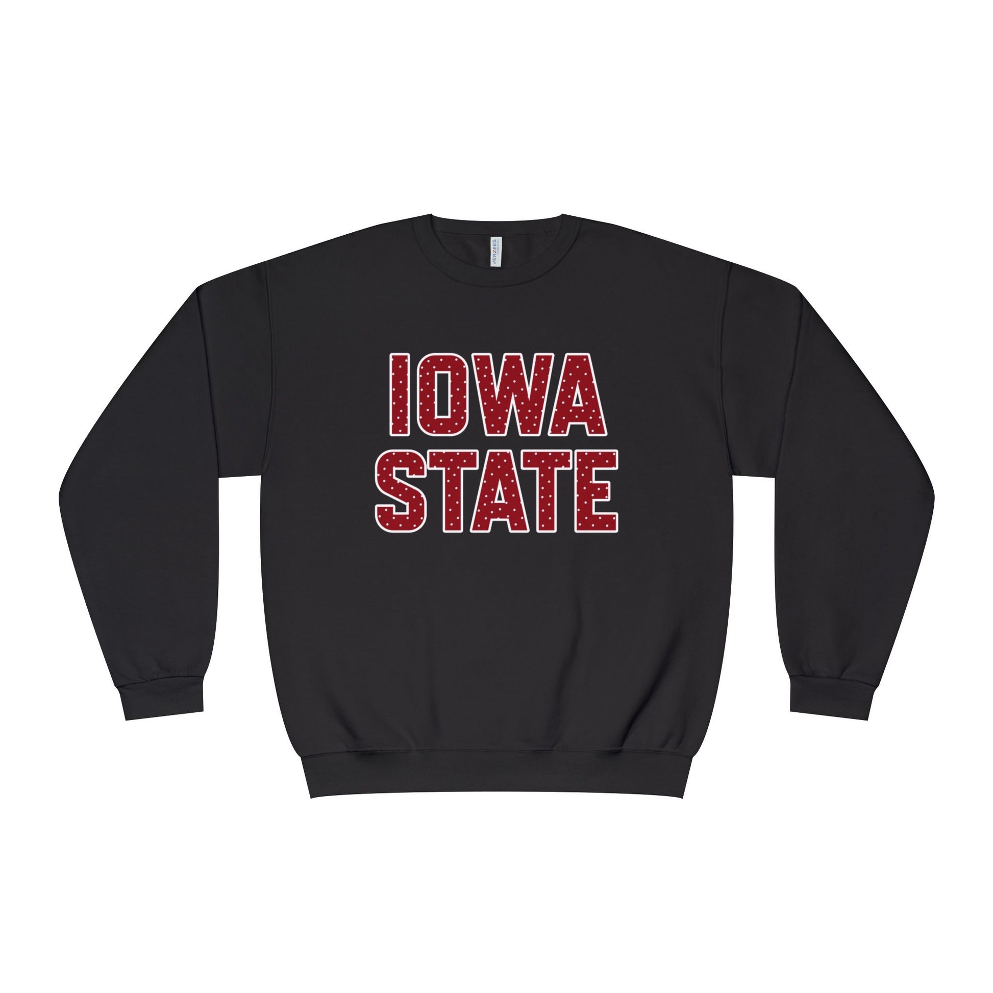 Show your Cyclone pride with this cozy, vintage-inspired crewneck featuring bold “IOWA STATE” lettering with a playful red polka-dot twist. Made with soft NuBlend® fleece, it has that lived-in feel from the first wear and holds its shape wash after wash. Perfect for game days, classes, coffee runs, or lazy weekends, it’s warm without being bulky and layers easily over any outfit.