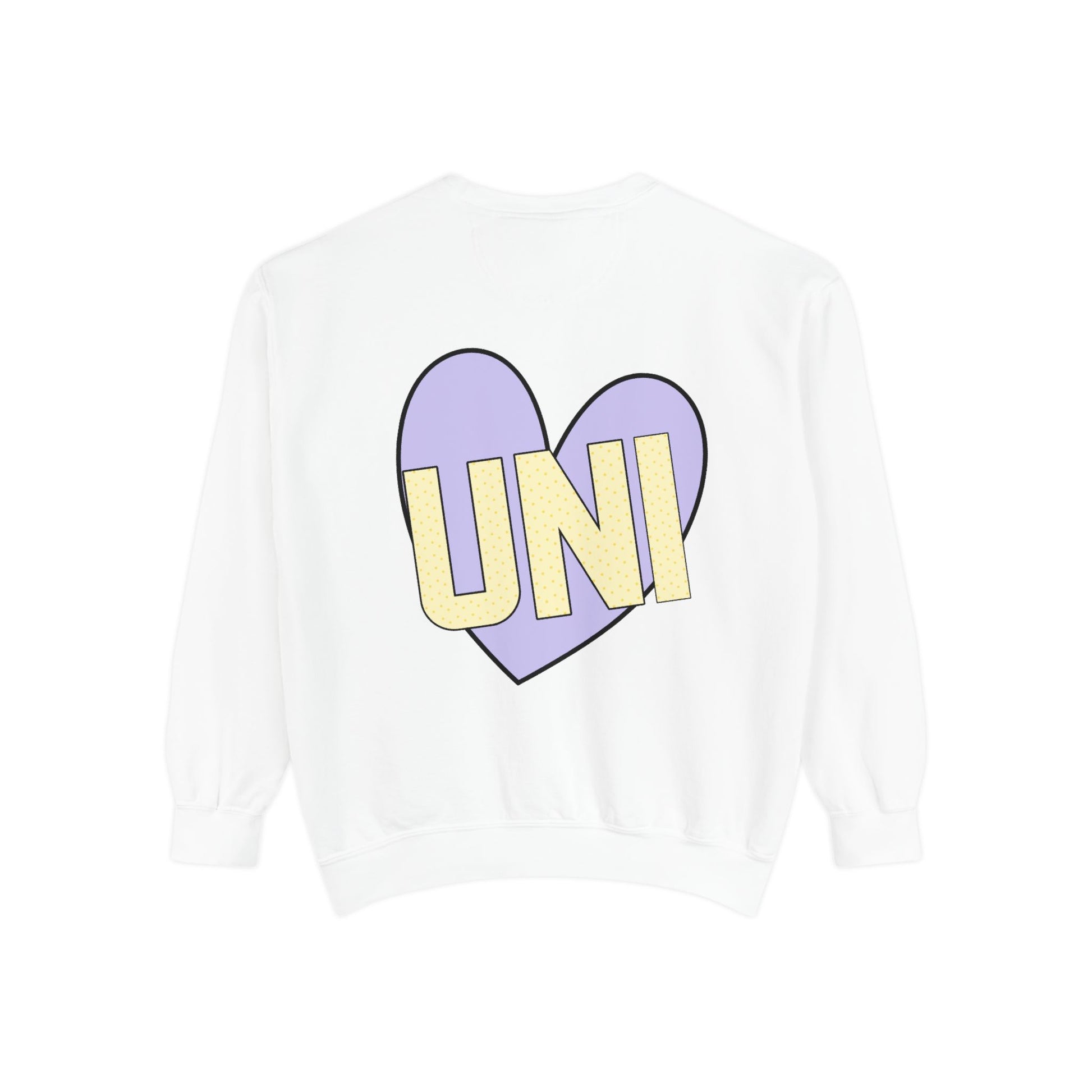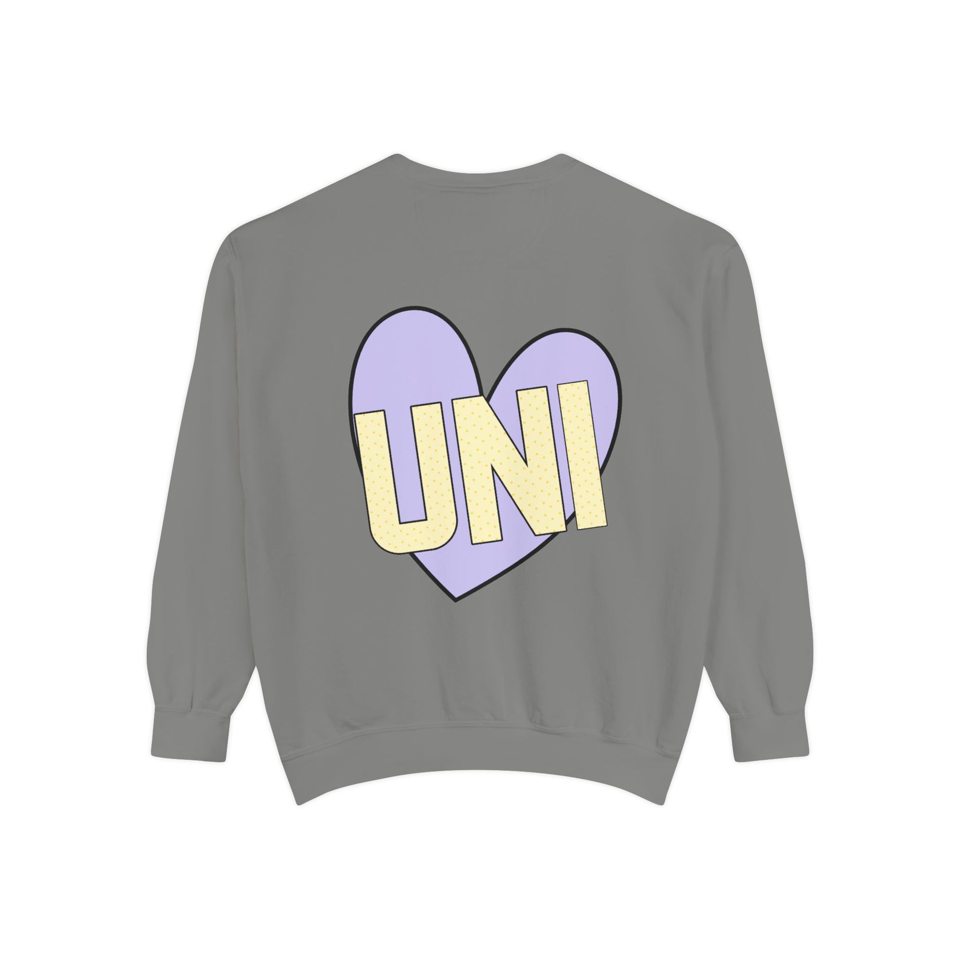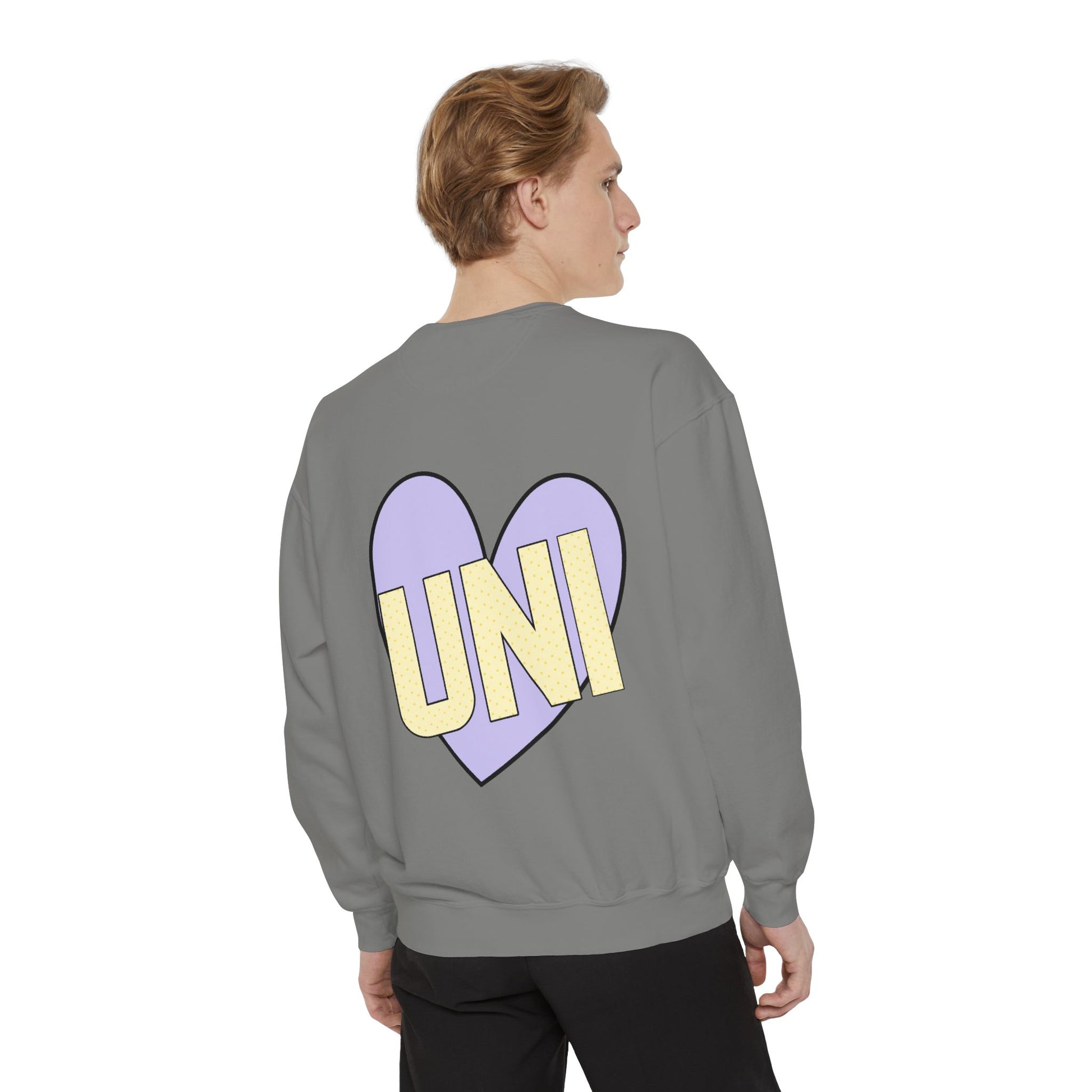 Soft, relaxed, and quietly expressive — this garment-dyed sweatshirt feels like an old favorite right out of the box. The slightly lived-in wash and medium-heavy knit wrap you in warmth without weighing you down. A playful lilac heart with bold, slightly vintage lettering sits on the left chest and blooms larger on the back, turning a simple sweatshirt into a wearable badge of personality. Cozy cuffs and a stretch-return ribbed hem keep the shape while the twill neck tape and half-moon back patch add small, thoughtful touches you’ll notice every time you pull it on. Choose embroidery for a tactile, raised finish that gives the design extra depth and an artisan feel.